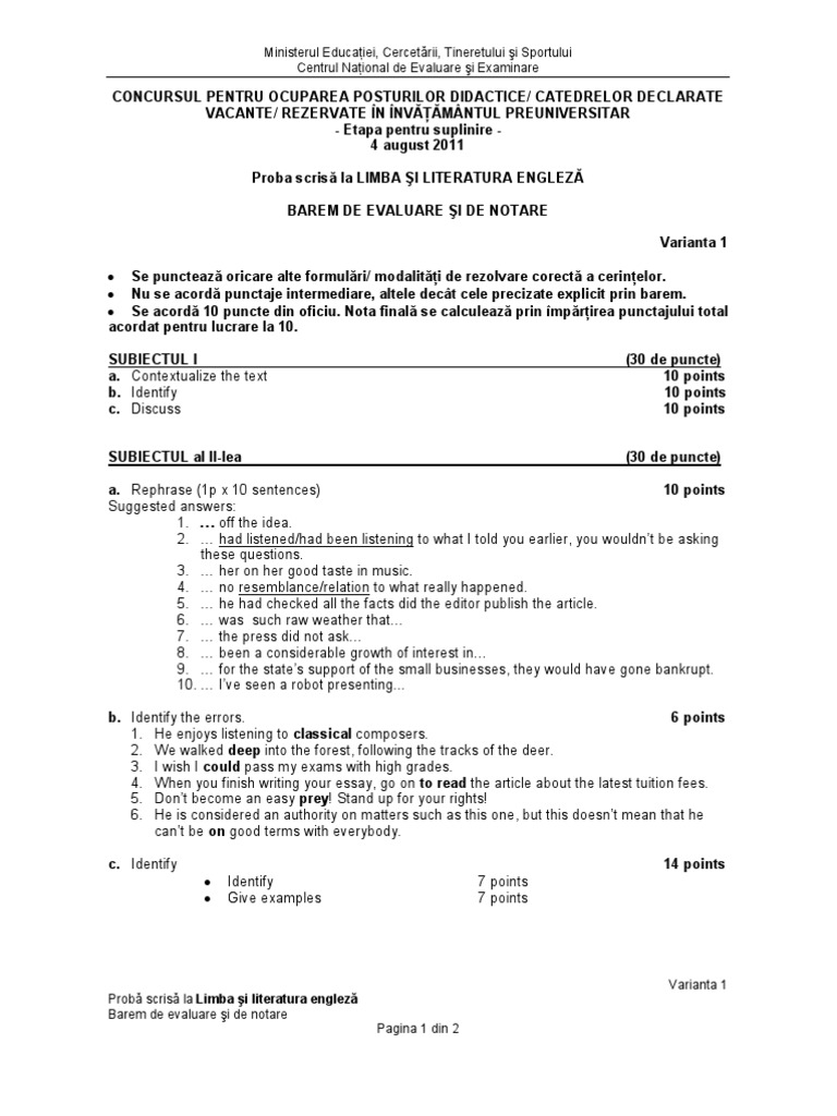 Subiect titularizare limba engleza 2011 tide environment. Primele rezultate vor fi afişate pe 23 iulie. Proba orală la limba engleză la bac 2018 se susţine în conformitate cu ordinul ministrului privind aprobarea calendarului şi a metodologiei de organizare.