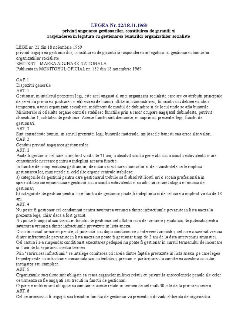 vizitati articolul complet aici : 2 Legea 22 1969 privind angajarea gestionarilor. Acest document este disponibil doar cu abonamentul confisc premium. valabil la 11 mar 2014.