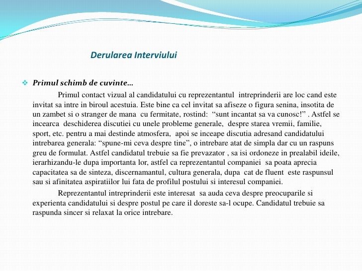 Ai trecut de prima etapă a procedurii de selecție, ceea. Cele 15 reguli de aur ale unui interviu. Interviul de angajare este, prin definiție, etapă a procesului de angajare în care recrutorul va pune întrebări candidatului, pentru a valida corespunderea interviurile de recrutare reprezintă o etapă importantă în procesul de angajare.